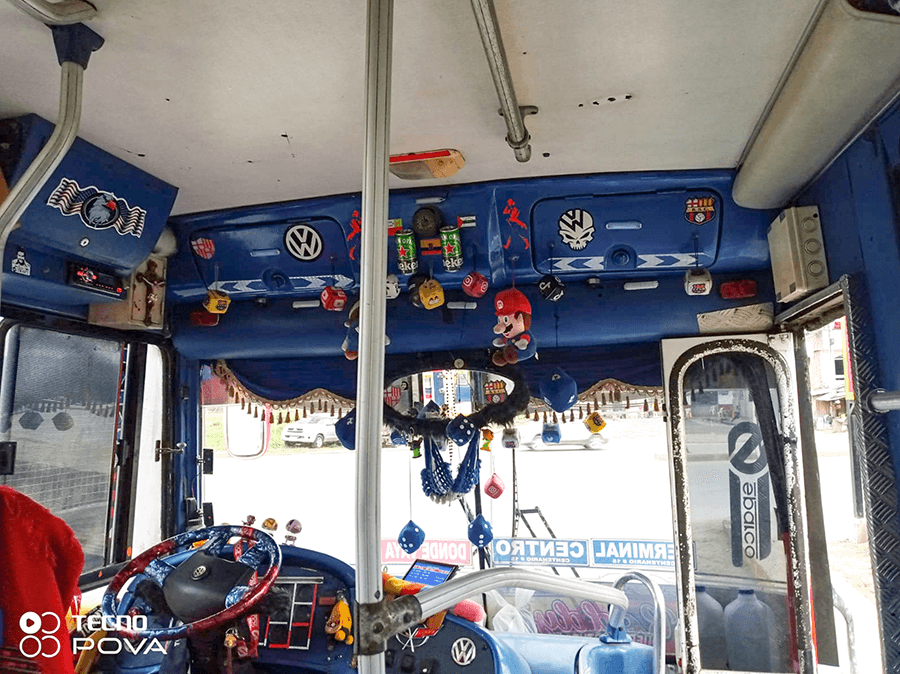 ¿Cómo se ha sentido cuando ingresa en un bus y observa el cuidado y alegría llena de colores que su propietario ha colocado en el techo, sobre el tablero, en el parabrisas, la palanca de cambios o su asiento? Así viaja muy bien acompañado de “atrapa sueños”, dados de la buena fortuna, el poderoso Mario Bross, algunos peluches, monitos colgantes, banderas de su equipo favorito, etc.
